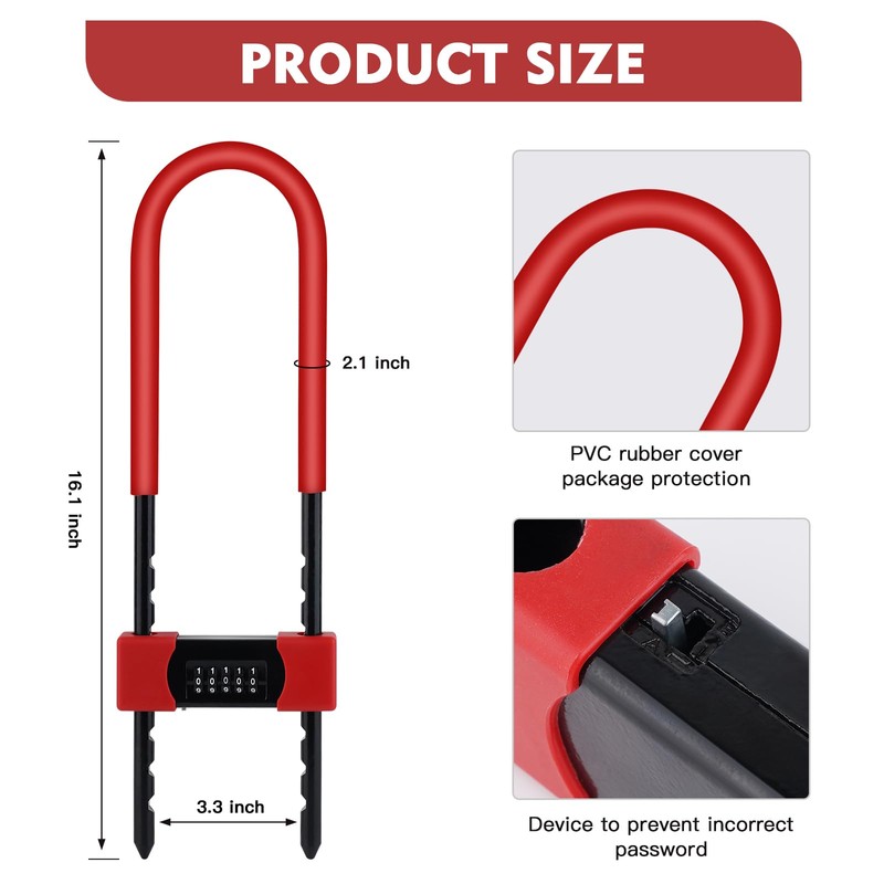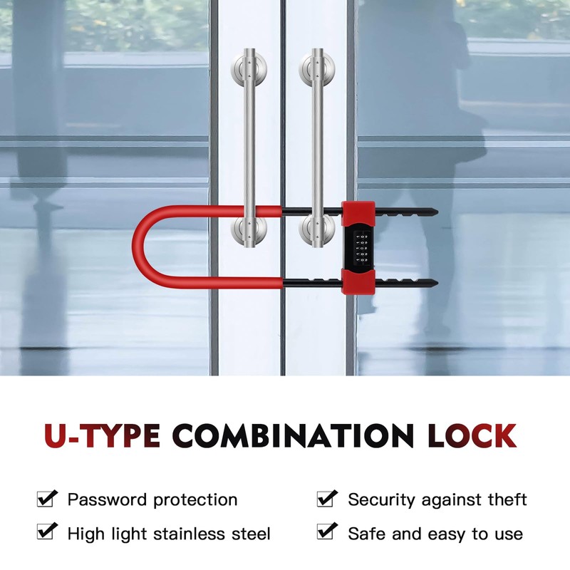 - 【Multi-function Adjustable Shackle】: Our upgraded bicycle U-lock is equipped with a 5-digit combination lock and a fully retractable adjustable U-shaped shackle. The maximum adjustable inner diameter of the locking beam is 270 mm/10.6 in., and the minimum is 160 mm/6.2 in. With a diameter of 16 mm / 0.6 inches, the large U Lock combo headphones can meet a variety of indoor and outdoor needs. It can be used for glass doors, bicycles, etc. The detachable shackle allows for flexible unlocking and locking.