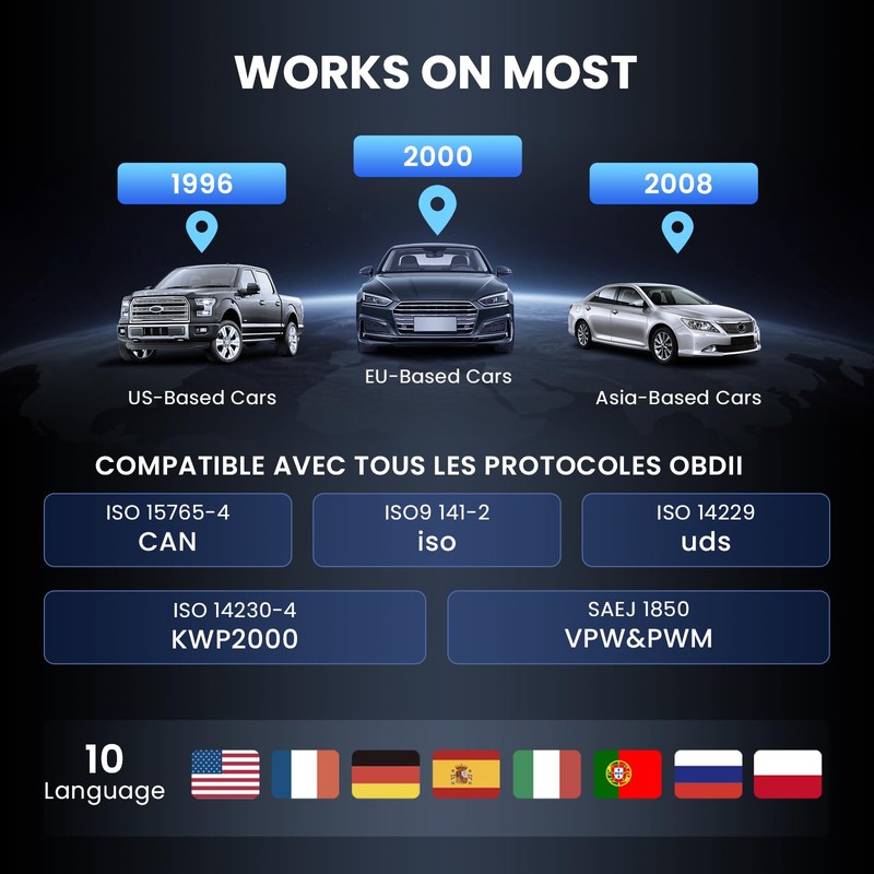 - Amplia compatibilidad: Escáner U MUCAR CDL20 para trabajo de automóvil con la mayoría de automóviles con sede en Estados Unidos, 2000 con sede en la UE y 2008 con sede en Asia que cumplen con OBDII (protocolos OBDII: KWP2000, ISO9141, J1850 VPW, J1850 PWM y CAN). Incluye sedanes de 12 voltios, SUV, camiones ligeros, mini furgonetas, híbridos, etc. Compatible con inglés, francés, español, alemán, ruso, italiano, portugués y polaco. Comprueba la compatibilidad con tu modelo de vehículo antes de comprar.