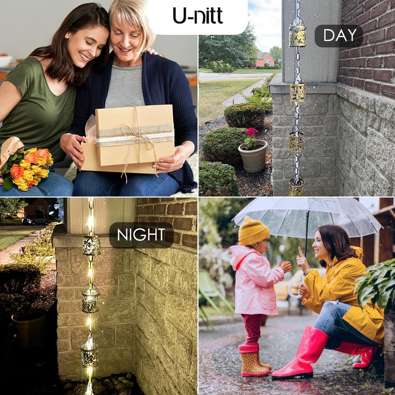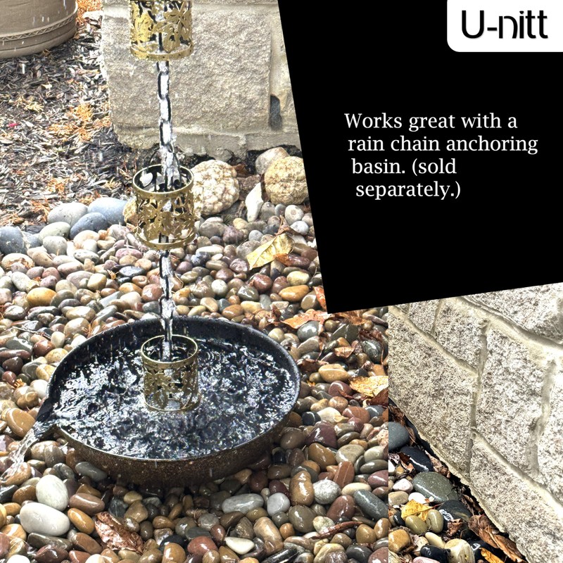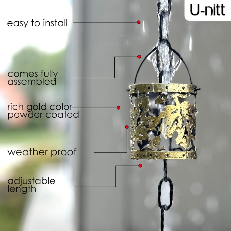 - Superior Craftsmanship and Customizable Length: Measuring 8.5 feet in length with 12 cups fully assembled and ready to hang. Cup size: top opening: 2.7", bottom opening: 2.7", height: 2.9". The gutter rain chain is suitable for most home gutter systems. Need a longer chain? Additional links and cups are available for purchase from U-nitt Rain Chains.