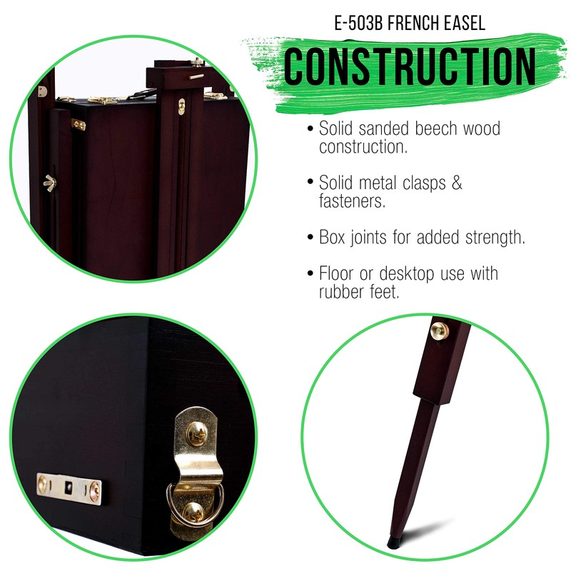 - A classically designed large plein air French style field and studio sketchbox easel that converts into a high tripod painting stand easel with a storage drawer. A black cherry colored wood easel box that's oil finished. Made with hand sanded high quality aged Beechwood that's grown in Germany. Also includes a 18 inch wooden painters palette.