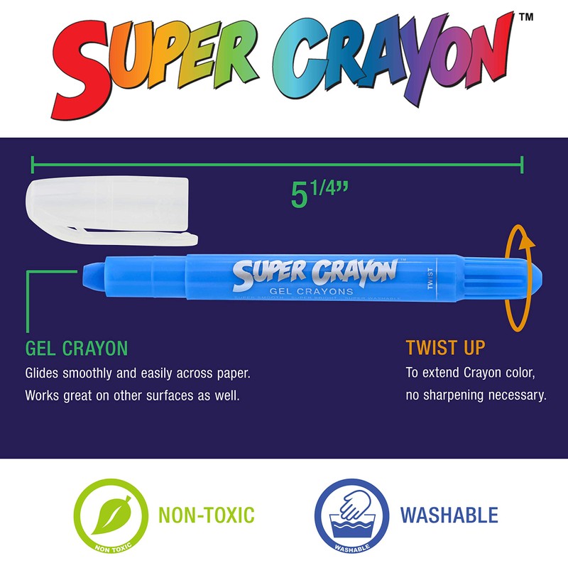 - 36 SUPER SMOOTH GEL CRAYONS: A rainbow of 36 eye-catching super bright, super smooth and super washable colors. Super Crayons are easy to use, easy to grip and apply color with a super smooth easy glide across the page. Twist up color delivery