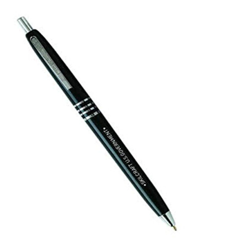 Retractable, refillable, ball point pen is imprinted with U.S. Government. The pen is designed to write anywhere regardless of climate or altitude! this is a rugged, yet economic workhorse of the U.S. Government and military and will write for one mile! ink does not skip or smear and has a brass refill cartridge for extended shelf life. Pen barrel indicates pen color.