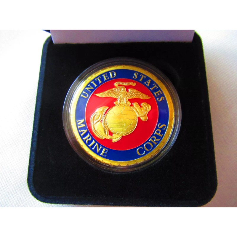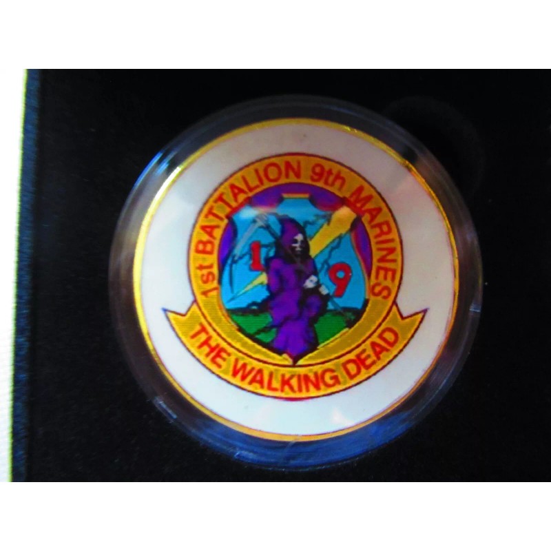 This is a great looking U S Marines, 1st Battalion, 9th Marines commemorative challenge coin. Coin has reeded edges and is about 1 9/16" in diameter. Front side of coin is printed and colorized while the rear side is raised lettering and gold plated. Coin is contained in an acrylic air tight holder and is displayed in an attractive black velvet presentation box which will make this a very impressive gift.