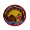 - 4 1/2" round Golden Shellback patch with fish, mermaids a trident-wielding Neptune, gold seahorses and more. Very colorful patch, iron On Backing