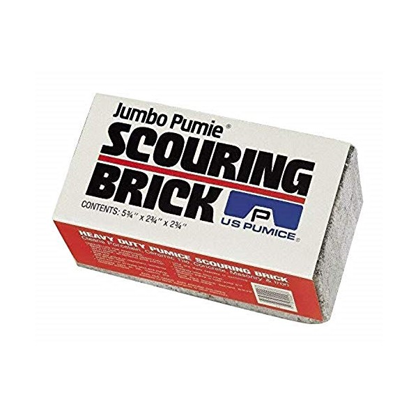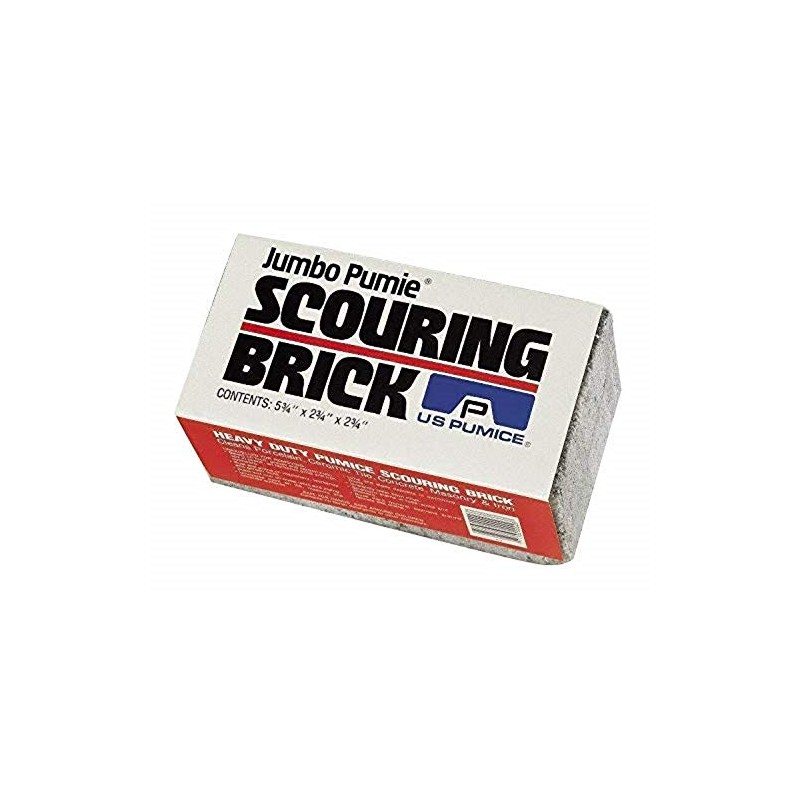 Pumie jumbo size scouring brick for large surface cleaning. Removes lime, scale, rust and paint from hard metals, porcelain, ceramic tile, concrete, masonry and stone work. Restores farm equipment, garden and workshop tools. Cleans pools and barbecues. Chemically neutral. Safe for hands. Safe to use and store around children and animals. Size: Jumbo 100% natural pumice stone Cleans pools and barbecues Chemically neutral Safe for hands Safe to use and store around children and animals An abrasive aid for cleaning large surface areas of lime scale, paint and carbonized grease Use on porcelain, ceramic tile, concrete, masonry and hard metal surfaces. Directions for use Pumie Power works when the strongest chemicals quit. Pumie is 100% pure pumice, a product used by professionals in many industries for tough cleaning jobs - carbon buildups, water and acid stains, paint, lime, rust and unwanted deposits on hard surfaces. Safe for hands. Safe for children. Contains no harsh detergents or other chemicals. Pumie works best in the presence of a liquid: water, oil or acid. First wet the brick. Then rub the edge or side on the surface you wish to clean using back and forth strokes. The paste buildup helps to clean and polish. Wash cleaned surface of residue. To clean brick hold under water faucet. Unexcelled for Removing: Rust and grime on machinery, workshop and garden tools. Scale and rust on metal work and piping. Unwanted paint on tile, masonry and concrete surfaces. Lime and algae deposits in swimming pools. Baked on food, grease and carbon buildups in ovens, on barbecues, grills and iron cookware. Rock-hard mineral deposits around faucets and drains. Do not use on soft, highly polished metals, unbaked enamel finishes, glass, fiberglass and other plastics. Some decorator tile and colored porcelain is fragile and may be damaged by abrasive cleaning materials. Test a small area before proceeding.