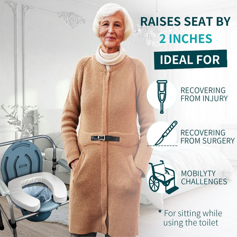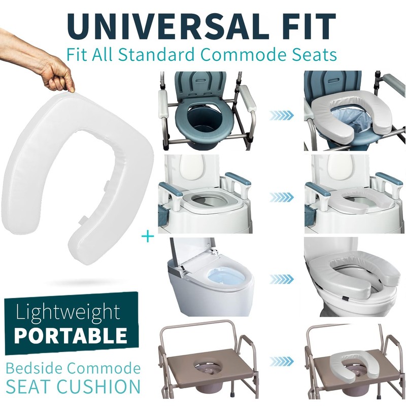 - Universal Fit for Most Bedside Commodes & Toilets. Sized 16"x15", QIUCHA U-shaped toilet seat riser cushion padded commode seat cushion fits most standard and elongated bedside toilet chairs, raised toilet seats, commode chairs, and potty chairs. Easy to install in seconds—no tools needed! Great for elderly users, those with limited mobility, or anyone recovering from injury or surgery.