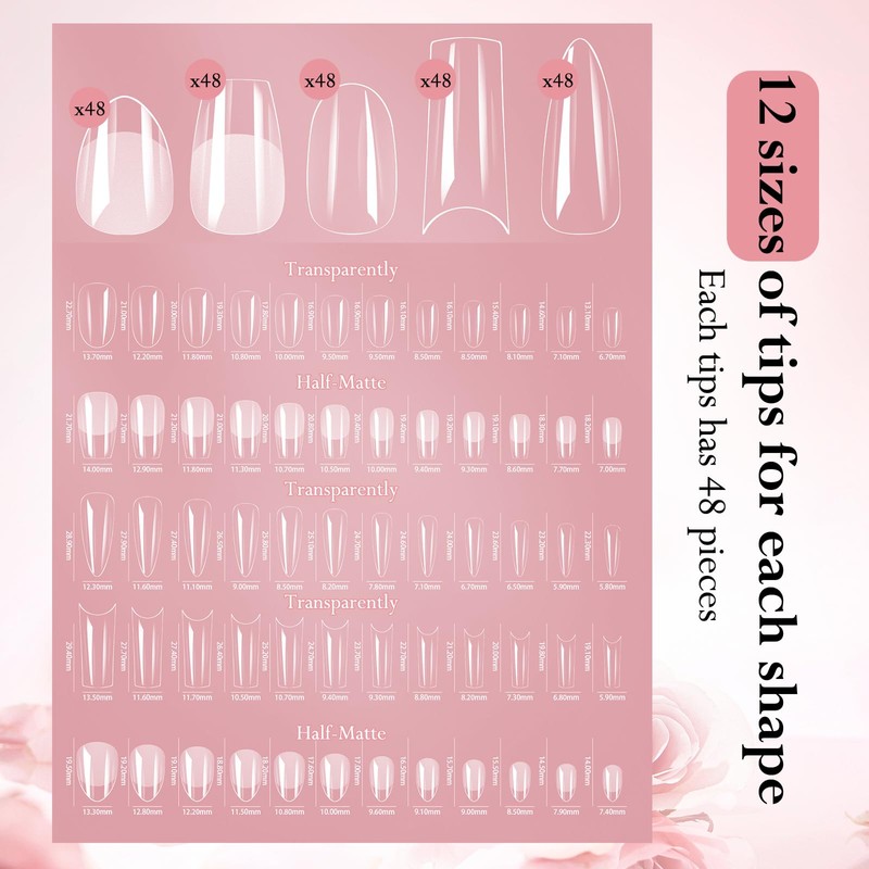 - MULTIPLE CHOICES: We include five different Artificial Acrylic False Nails in one box, each shape we provide 12 different sizes, and each shape of Clear Acrylic Nail Tips we include 48 pieces. You can DIY your nails to your heart's content and try every shape of press on nails