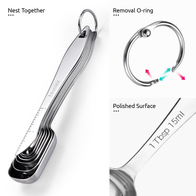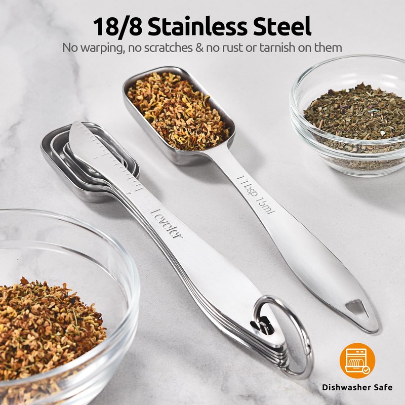 • Need durable measuring spoons that won't rust? This stainless steel measuring spoon set is crafted from high-quality 18/8 stainless steel, ensuring no warping, scratches, rust, or tarnish, even after repeated use in your kitchen. These metal measuring spoons are designed to withstand the toughest kitchen tasks, making them a long-lasting addition to your baking and cooking routine. Say goodbye to flimsy spoons that degrade over time!