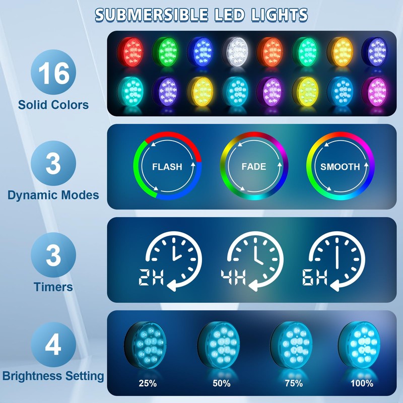 - Wide ApplicationThe waterproof LED underwater light has a wide range of applications, great for in-ground swimming pools, above-ground swimming pools, fish tanks, camping buckets, coolers, ponds, fountains, hot tubs, aquariums, disco bars, vases, festival lanterns, parties, and many other occasions. If you have any questions, please do not hesitate to get in touch with us
