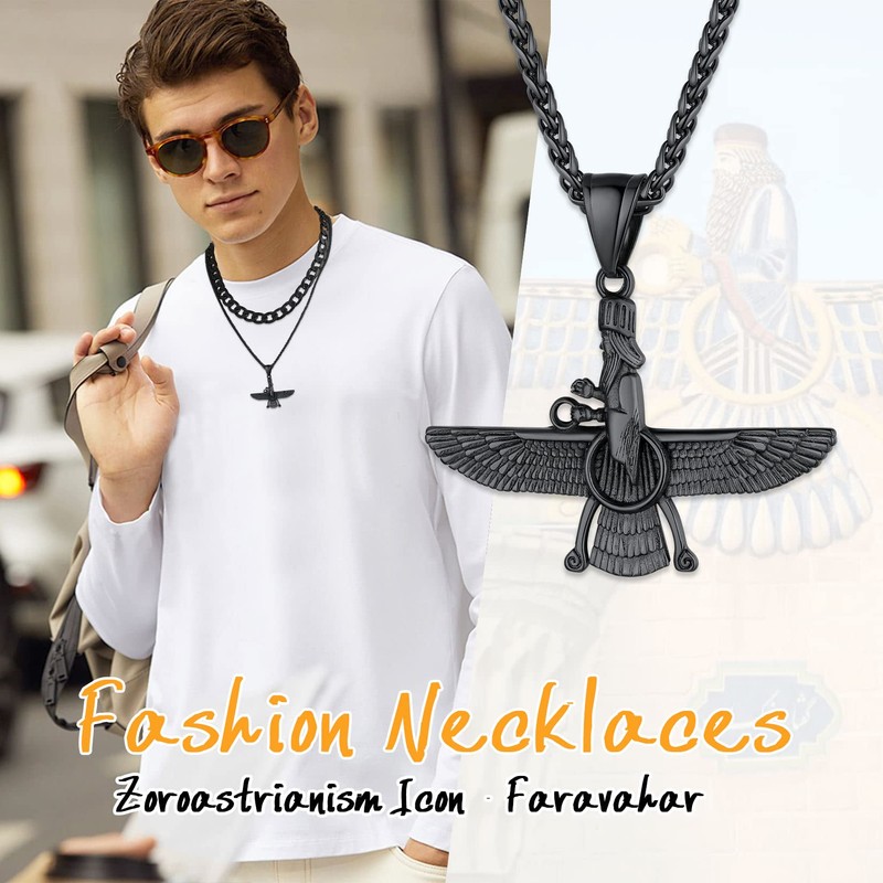 U7 Pravarti Faravahar Pendant Necklace For Men Women Black Wheat Chain Zoroastrian Talisman Jewellery