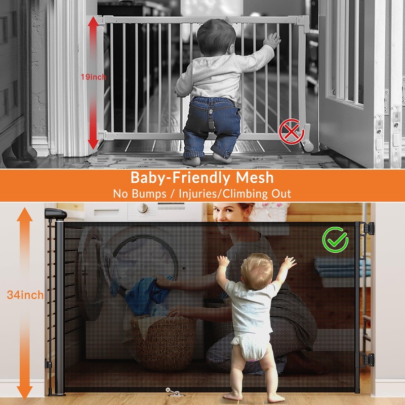 - 【Flexible Partition】The retractable gate is a versatile solution that can be used as a mesh baby gate, a mesh dog gate, or even a semi-enclosed play yard. It also fun barrier or room divider, allowing you to create flexible spaces for both your babies and pets.