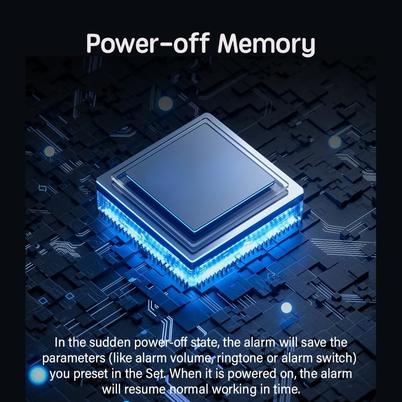 • 【Power-off Memory Function】In the sudden power-off state, the alarm will save the parameters (like alarm volume, ringtone or alarm switch)you preset in the Set. When it is powered on, the alarm will resume normal working in time.