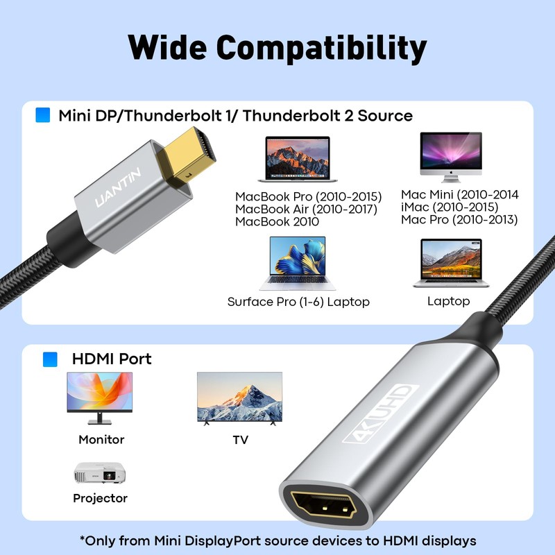 - [4K Ultra HD] The UANTIN Mini DisplayPort to HDMI adapter supports 4K@30Hz ultra-high definition resolution, providing smooth images without blurring and accurately reproducing every detail to deliver cinema-quality picture quality. Whether it's high-definition movies, design drawings, or game graphics, it eliminates lag and tearing to provide a smooth and seamless visual experience.