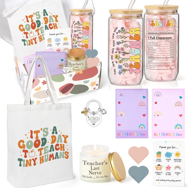 - Best Teacher Gifts for Women:This well-designed teacher gift set includes 1* teacher themed glass cup; 1* “Teacher's Last Nerve” scented candle; 1* funny keychain; 2* “Best Teacher Ever”Sticky note book; 1* canvas tote bag; 2* heart-shaped leather bookmarks, 1* thank you card and gift box. Each item is full of personality and warmth, perfect for showing appreciation and respect
