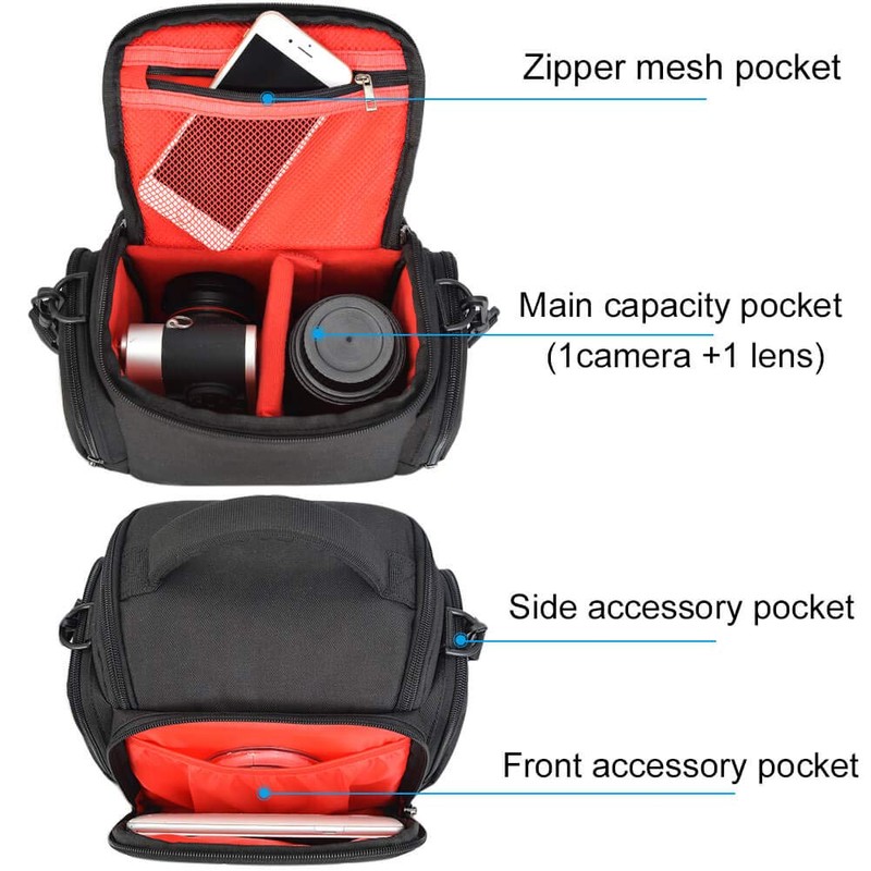 - 【Multiple Compartments】There are multiple compartments in the camera bag: 1 main compartment (with 1 removable divider and top mesh pocket), 1 outer compartment and 2 side pockets.