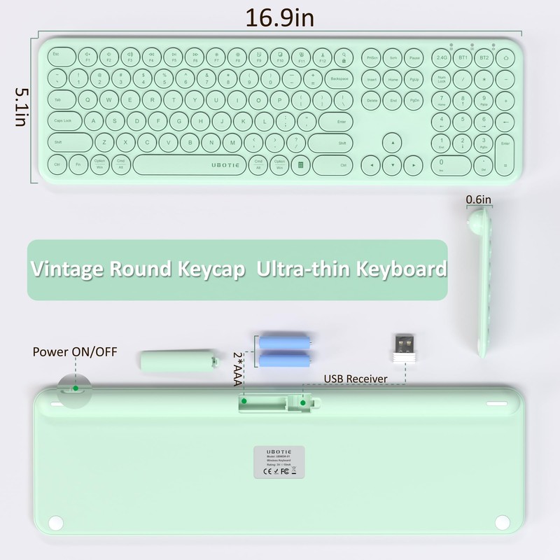 UBOTIE Wireless Green Keyboard, Bluetooth 2.4GHz Dural Mode Connection Scissor Switches Slim Quiet Round Keycaps Full Size Office Computer Keyboards for PC MAC Smart Phones