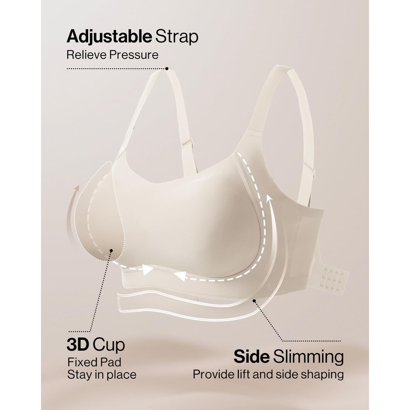 Ubras Lift Support Bra with Widen Side, Full Coverage Seamless Bralette no Underwire, No Show Comfortable Bra (Cream-XL)