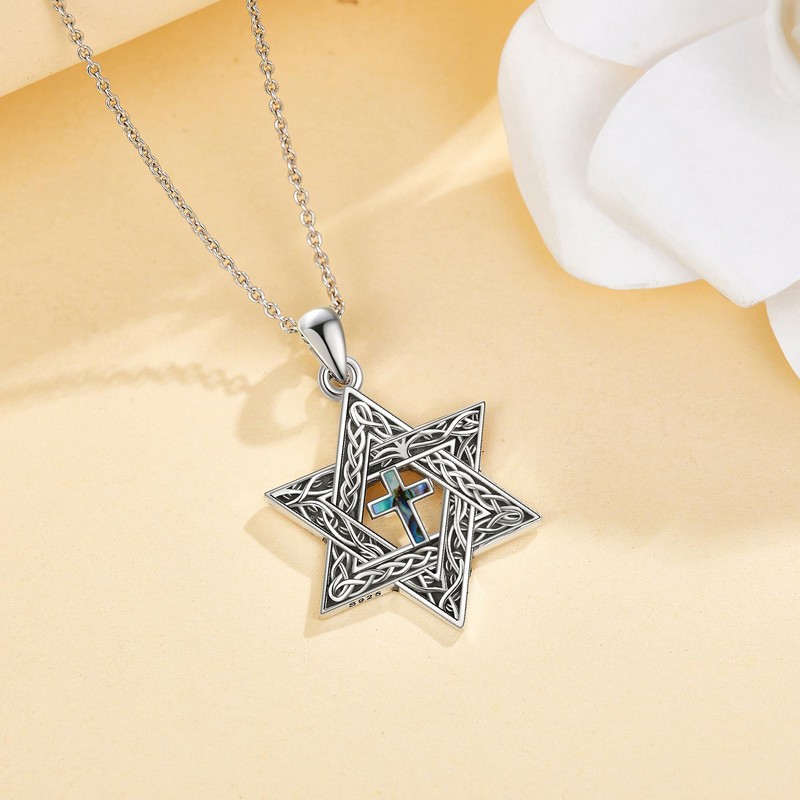 【Star of David Necklace】 The Star of David, known as the "Shield of David" or "Magen David" in Hebrew, is a recognized symbol of modern Jewish identity and Judaism. It is now widely used in daily life and also represents energy and strength. 【Messianic Jewelry】 Two connected triangles incorporate the classic tree of life pattern and Celtic knots, with the shape of a cross in the center. The seemingly simple design is rich in details.
