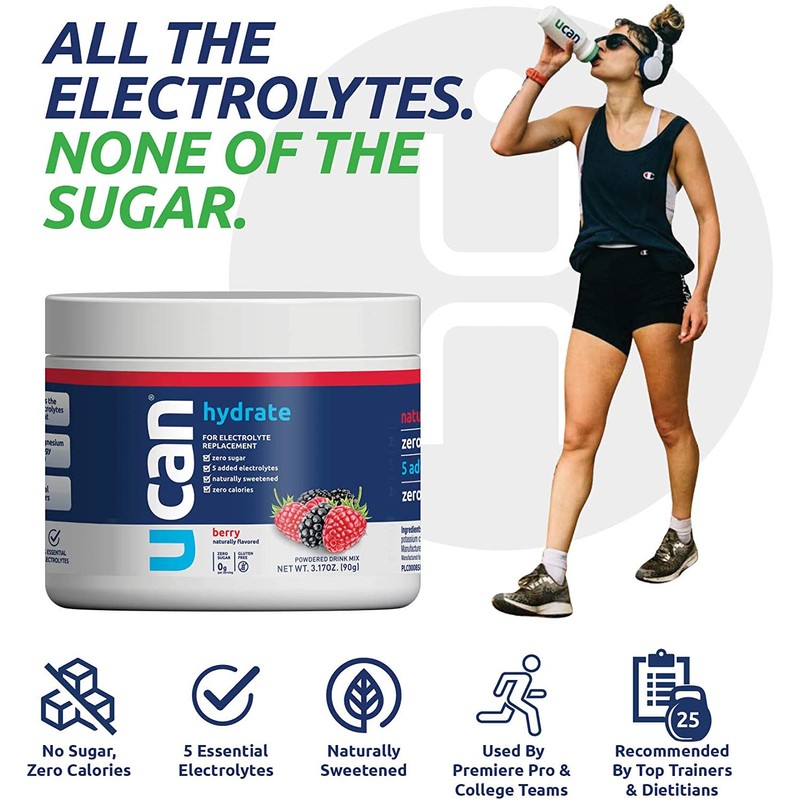 • CLEAN, SUGAR FREE HYDRATION - Skip the sugary sports drinks and rehydrate with UCAN. Sugar free packets are portable, easy to use, and mix instantly with no acesulfame potassium, sodium benzoate, or artificial sweeteners. Unlike other hydration products, UCAN Hydrate is a zero sugar electrolyte powder for a clean way to replenish the electrolytes lost in sweat.