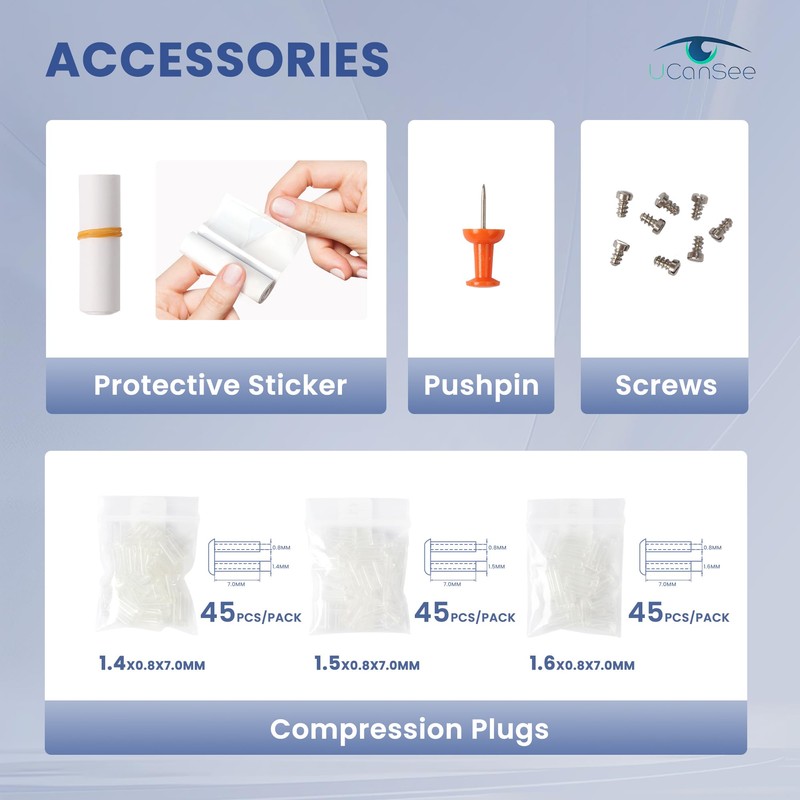 ✔ [Mounting Sleeves] - These ensure lens stability in rimless glasses. They come in three sizes: 1.4x0.8x7.0mm, 1.5x0.8x7.0mm, and 1.6x0.8x7.0mm.