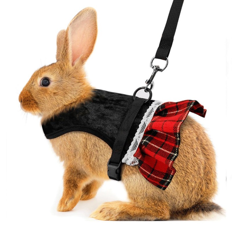Uccellino Rabbit Ruffle Harness, Adjustable Length, Lead, Easy Installation, Clothes, Checkered Pattern, Rabbit Harness (Black, S)