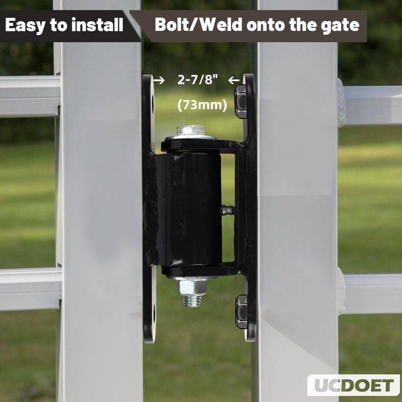 - EASY TO INSTALL: The gate hinge plate is 7"L*1.5"W*6mm thickness steel, 2 7/8" between post and the gate and can bolt with M12(not included) or weld on directly to the gate and post