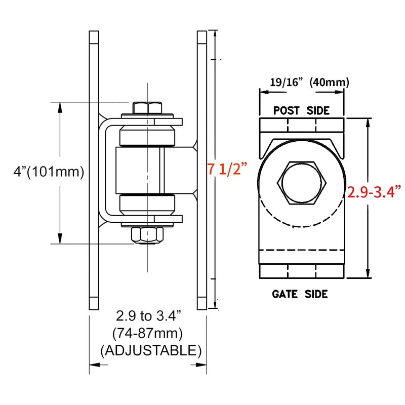 - EASY TO INSTALL& ADJUSTABLE: This heavy hinge plate is 7.5"L*1.57”W*6mm thickness, 2.9 to 3.4”(ADJUSTABLE) between post and the gate, can bolt on or weld on the gate easily, sold as 1 pair (not screws)