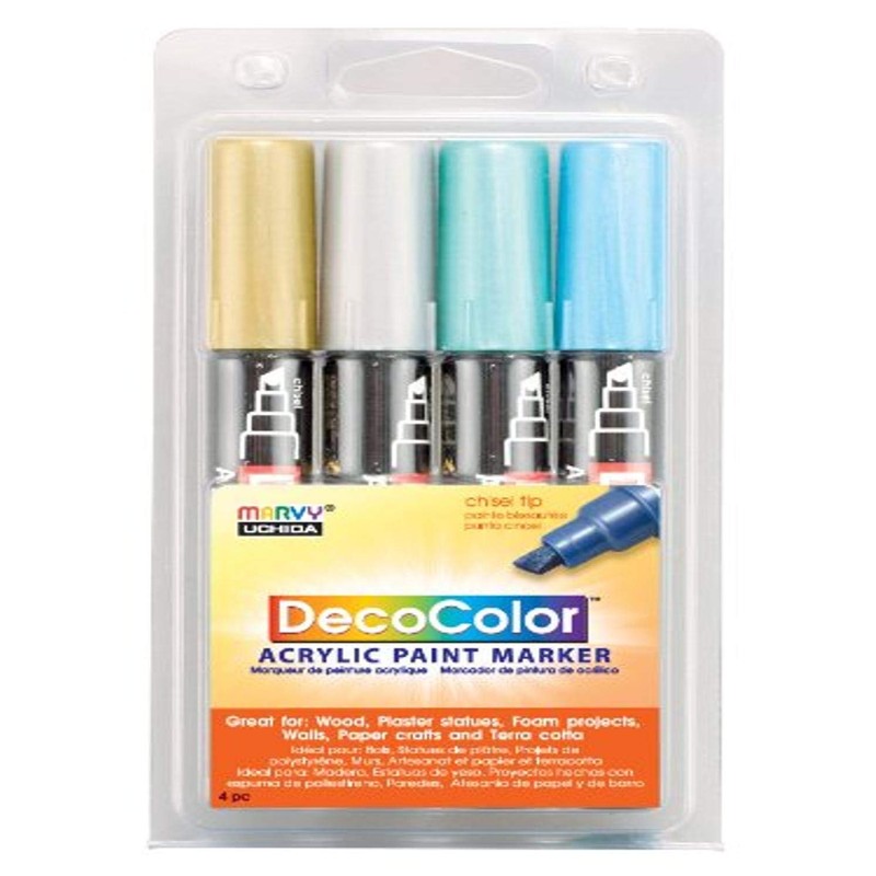 - DecoColor acrylic paint marker has a rugged three way chisel tip that allows for thick and thin lines