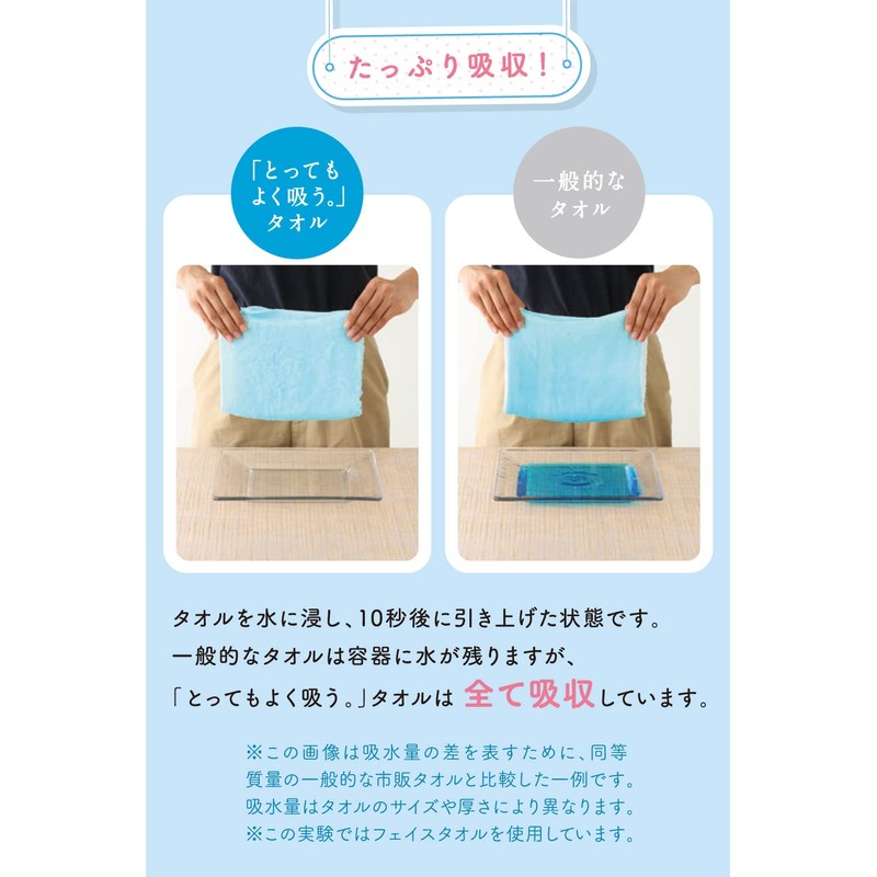 • (Generous Absorption) Based on customer feedback "want a towel that absorbs well", we developed a product with superior water absorption capacity than conventional towels. JIS standards for water absorption is also conducted to a level of water absorption compared to regular towels