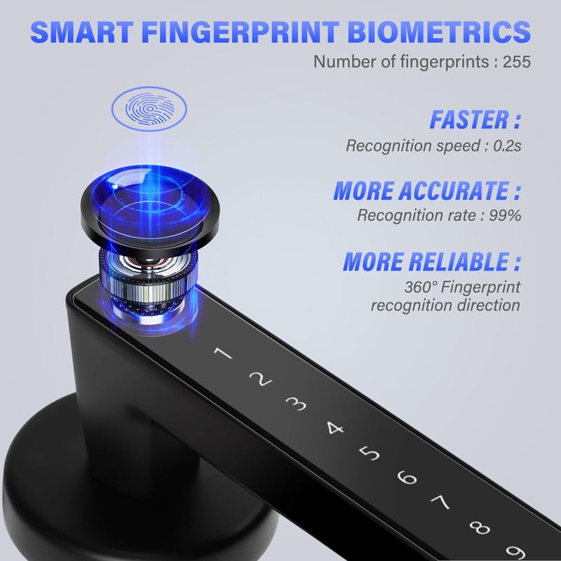 - 【Easy to Install】 Use a screwdriver and drill bit to install in about 20 minutes. It is applicable to most Canadian standard left and right wooden doors, with a thickness of 1.49-1.97 inches and a diameter of 2-1/8 inches, adjustable latch 2-3/8"or 2-3/4". This biometric door lock is also applicable to metal doors.The bedroom door lock has the protection function of automatic locking, 5 seconds automatically locked after unlocking. It's perfect for houses, apartments, Offices, Hotels