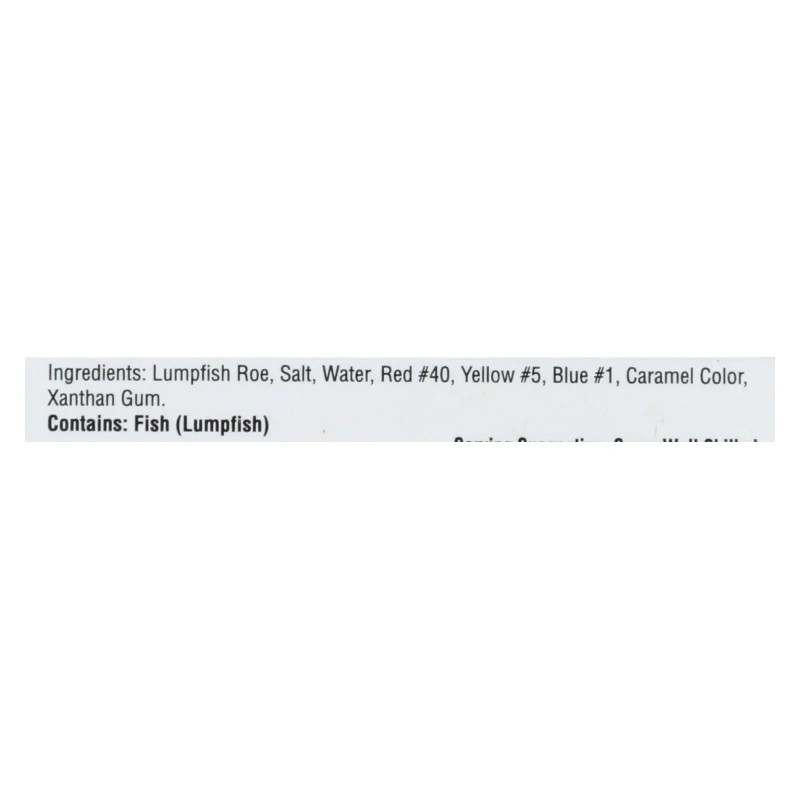 ingredients : lumpfish roe;dextrose;salt;water;xanthan gum;lemon juice from concentrate;natural flavor;caramel color;rice vinegar;red #40;yellow #5;blue #1
