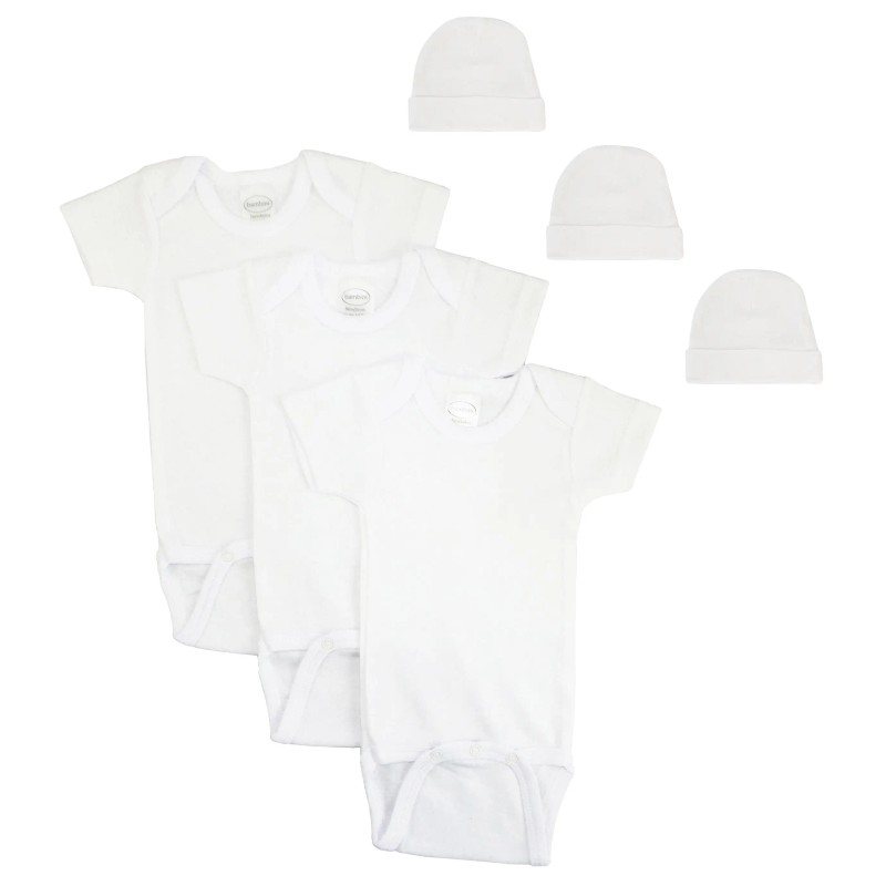 Short Sleeve Onezie Bodysuits (100% Cotton), Short Sleeve Onezie Bodysuits (100% Cotton), Short Sleeve Onezie Bodysuits (100% Cotton), White Baby Cap (100% Cotton), White Baby Cap (100% Cotton), White Baby Cap (100% Cotton)
