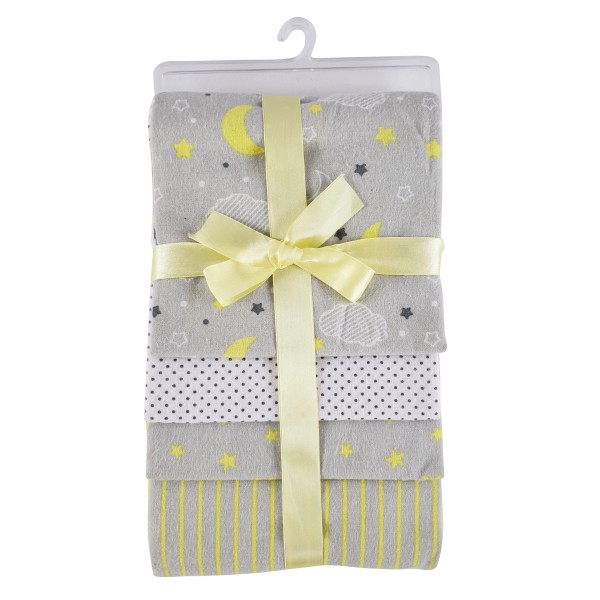 Bambini 4 pack flannel receiving blankets keeps your little one warm and cozy. Ideal for using as a playmate, as an extra in the diaper bag and for any indoor or outside activity. Finished edges for added durability and to prevent fraying. The 100% cotton flannel feels soft on baby skin. Great item for gift giving. 100% Cotton Flannel Colors: Yellow / Grey Assorted Prints 4 Per Pack