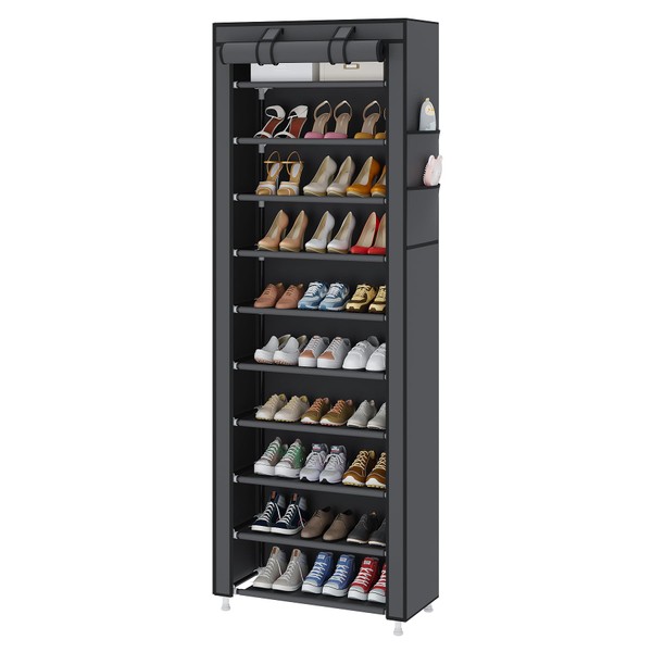 - 【Multifunctional】This 10 tier shoe rack with 2 large side pockets offers lots of storage room, 24.41" wide x 11.02" deep x 70.08" tall,can hold 27-30pairs of shoes. An satisfying entryway shoe storage organizer for storing two-three pairs of shoes on each shelf.Different footwear types, footwear such as sneakers, sandals, slippers, flip-flops and pumps; high heels; short boots. This tall shoe rack organizer ensure organize your shoes neatly and do not leave them to clutter your space or become an eyesore. Also you can quickly choose the ideal shoes.