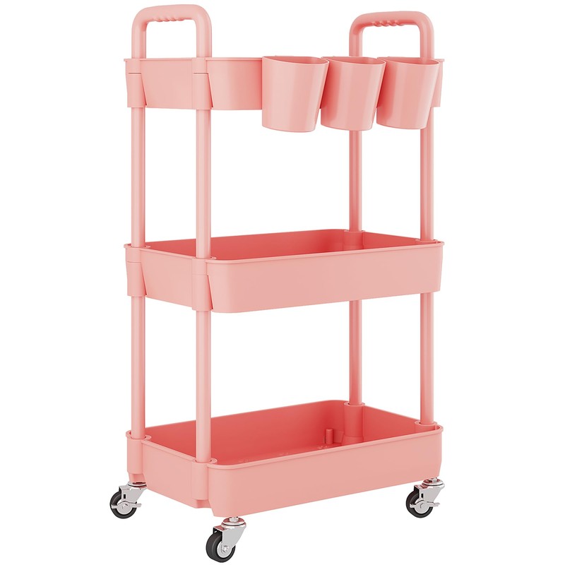 UDEAR 3-Tier Rolling Utility Cart,Multifunctional Storage Shelves with Handle and Lockable Wheels for Room,Office,Kitchen,Bathroom,with 3 Hanging Cups,Pink