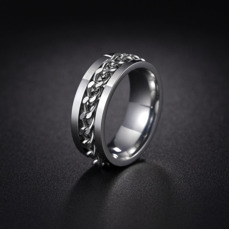 - Stress-Relief Fidget Rings: Grooved edge and curb chain inlaid design, masculine and trendy. Manually spinning the chain helps effectively relieve anxiety, stress, or other negative emotions