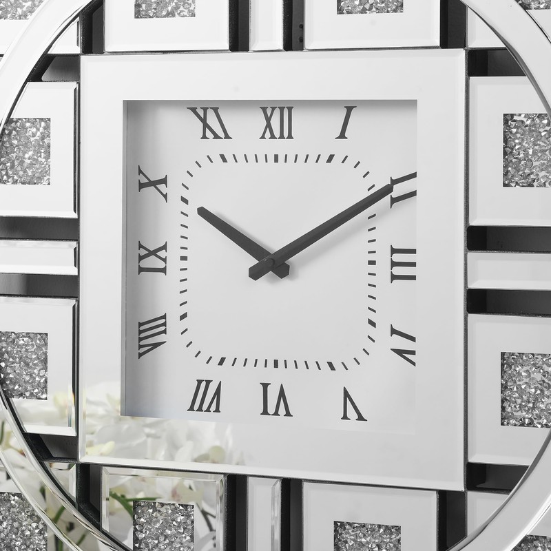 Key FeaturesThe stylish square design and mirrored trim make this wall clock a statement piece for any room. The faux gemstone inlay adds a unique and luxurious touch to the overall design, enhancing its visual appeal.