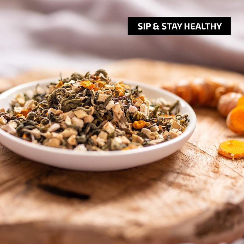 - Immunity-Boosting Blend: Our Turmeric Spice Green Loose Leaf Tea is crafted with a blend of turmeric, ginger, and tulsi, all known for their powerful immunity-boosting properties. Enjoy a cup that helps support your overall health and well-being.