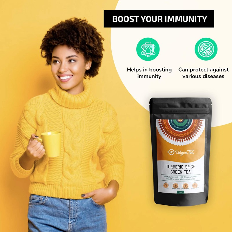 Udyan Tea Turmeric Spice Green Tea, 100g (40 Cups) | Turmeric Tea Blend with Ginger, Holy Basil for Indian Ayurvedic Healing, Immunity & Health | 100% Natural Loose Leaf Tea