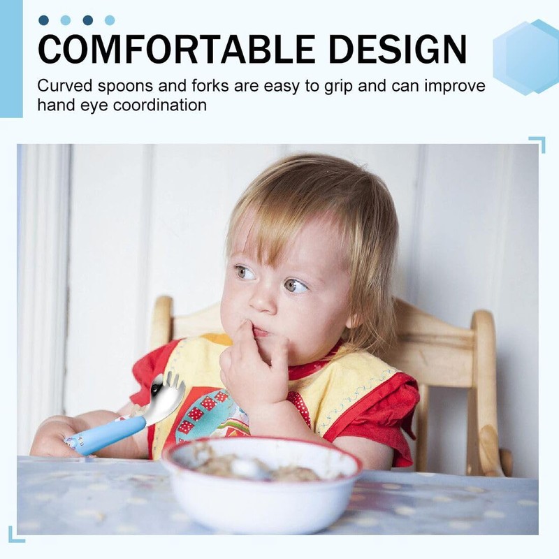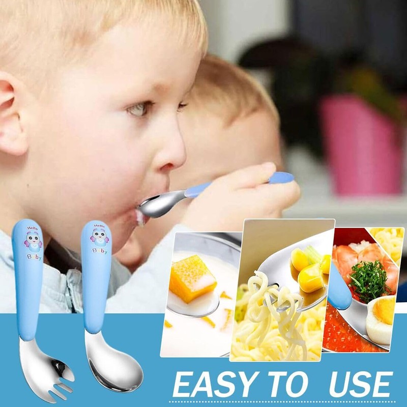 UEIOAVL Toddler Cutlery Sets 1 Curved Spoon + 1 Curved Fork Kids Tableware Set Curved Handle Training Spoon Fork Stainless Steel Handle Heat Resistant Self-Learning Spoon (Blue)