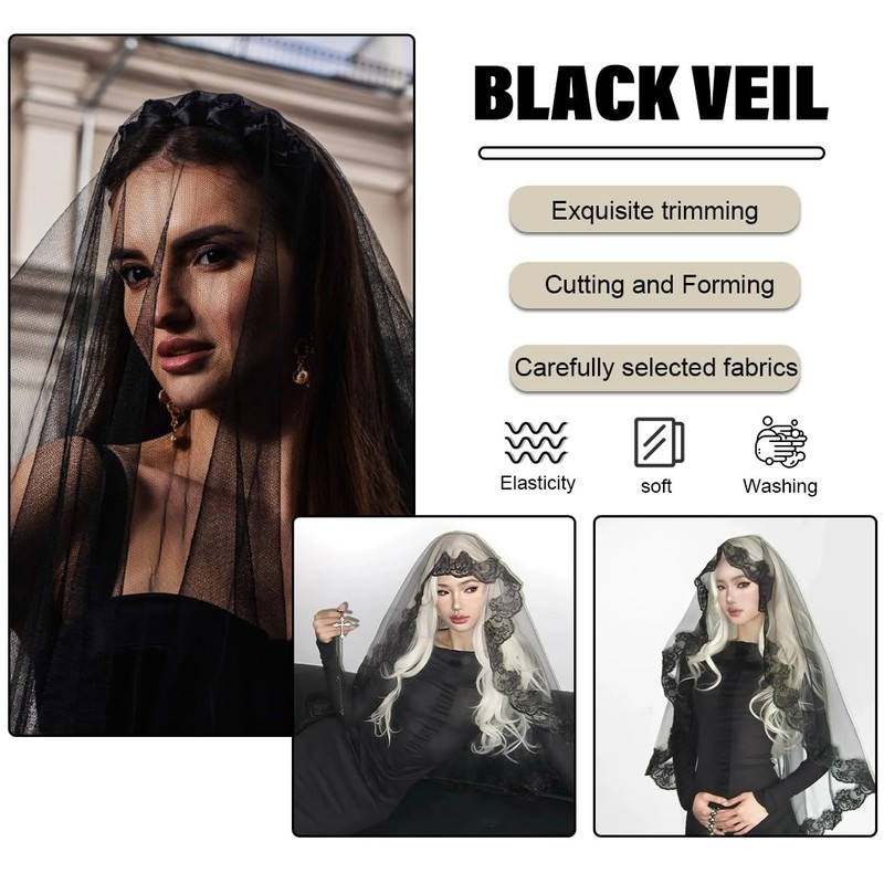 UEIOAVL Veil, 1 Piece Veil Bridal Veil Black Veil Lace with Comb Headband Party Decoration Gothic for Carnival Witch Cosplay (Black)