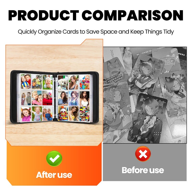 - HIGH-QUALITY CARD BINDER:Our card binder photo album is made of waterproof PU leather and shock-absorbent EVA foam lining. It has good shockproof,dustproof,and moisture-resistant properties. The internal page of the binder is made of PP material that is highly transparent and easy to display and browse. The sturdy zipper design can effectively prevent the card from being lost when carrying it.