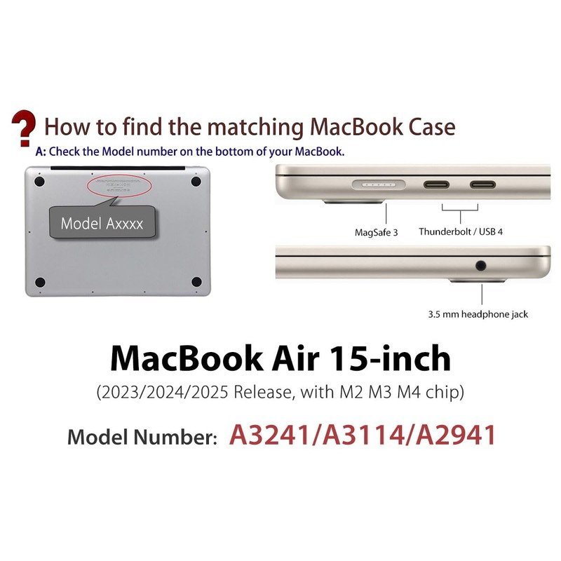 There is a simple way to help you find the matched case compatible with your MacBook from these various version cases, Before ordering, please double check your MacBook's model number(Axxxx) on the bottom of your laptop as the images show.