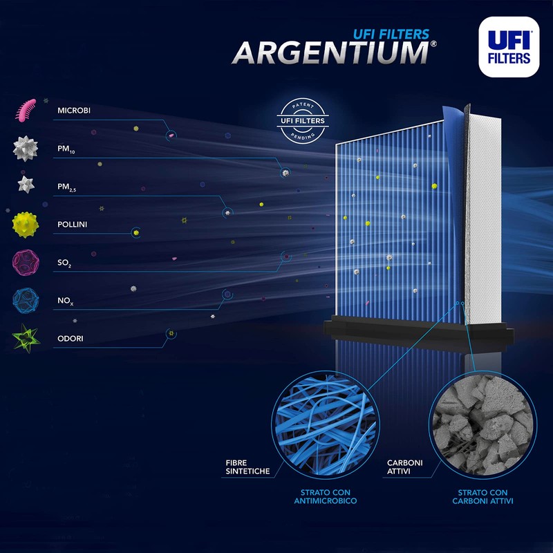 • Argentium is the new filter medium created and manufactured by UFI Filters thanks to its experience in the field of research and development of new materials. The revolutionary filter medium is made of non-woven fabric with integrated silver particles that have a strong antimicrobial effect. Argentium retains its antimicrobial properties unchanged throughout its life cycle, unlike the solutions available on the market today.