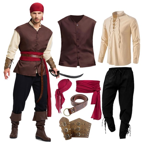 The 7-Pcs Men's Pirate Costume Set Includes: Shirt*1, Pant*1, Vest*1, Medieval Embossed Belt*1, Bracer*2, Red Bandana Headscarf*1, Sash Belt*1.