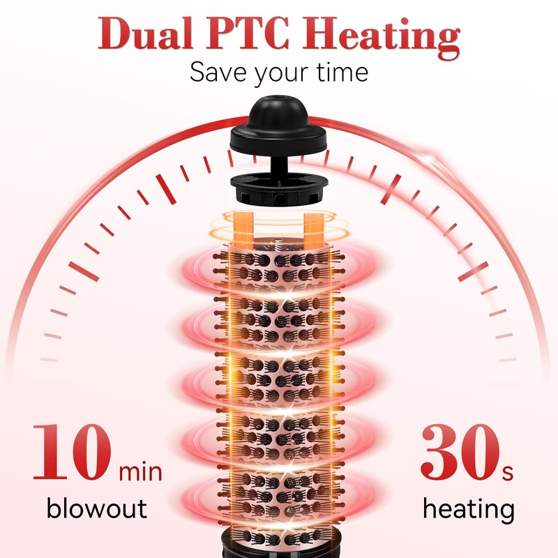 - Quick Styling With Dual Ptc Heating: Achieve the perfect blowout in just 30 seconds with this thermal brush! Equipped with dual PTC heating tubes, it saves you time and delivers smooth, salon-quality results effortlessly. Say goodbye to long styling sessions