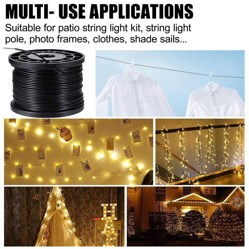 - SAFE AND DURABLE: 7 x 7 strands construction, bare OD is 1/16", coated OD is 3/32". Breaking Strength is 480lbs. 480lbs breaking strength ensures its outstanding durability and long-lasting secure hold for the string lights without snagging once pulled tightly.