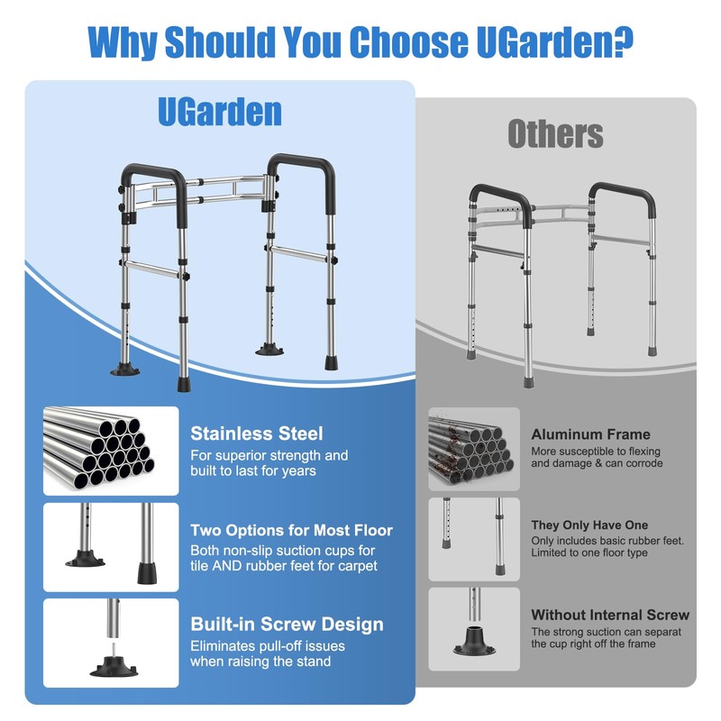 - 【Non-slip Design & Enhanced Stability】UGarden stainless steel toilet rails employs a differentiated anti-slip design: The rear feet are equipped with rubber suction cups that provide strong suction on smooth tile surfaces to enhance stability, while the front feet have non-slip rubber pads suitable for various floor types. Working together, they ensure reliable support during sitting and standing. The armrests are padded with soft foam for a comfortable and secure grip