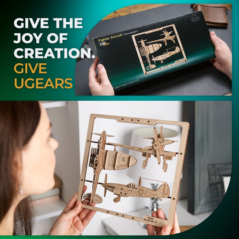 Introducing the Fighter Aircraft from the Classic Vehicle Collection, the first release in the new series of 2.5D puzzles, the new series of UGEARS flying into the glorious past. These building kits combine the thrill of building a 3D machine model with the joy of showcasing your own frames. Iconic UGEARS DESIGN: Like our 3D machine models, this airplane construction kit is a mini version of the legend of reality. The Fighter 2.5D Puzzle is a classic Spitfire model in the 1940s and is the famous WWII fighter aircraft used by RAF and other allions. Viewers can explore the airplane from three angles to interact with movable air rails, propellers, wheels, and canopy. DISH ADVENTURE FOR DISPLAY: This is a fun DIY project and a great decoration piece. Fighter Aircraft is a flat 3D model offered in a unique frame, suitable for static display on walls, shelves and desks. GREAT FOR BEGINNERS: The UGEARS Fighter Aircraft 2.5D Puzzle is a "easy" DIY airplane model kit for both adults and children. Includes 47 pieces to ensure a fun 20-30 minute assembly time. EVERYTHING INCLUDED: All UGEARS hobby kits for adults come with tools, additional parts, and illustrated instructions in 11 languages. Simply die cut the laser pre-cut part from the board and snap it to create a complete image model with moving parts. THOUGHTFUL GIFT: Building an airplane model kit will delight pilots, cabin crews and aviation nerd. Also, UGEARS 2.5D Wooden Puzzles are perfect for anyone who enjoys decorating their own beautiful and handcrafted pieces. Explore the magical world of mechanics and vintage artifacts Welcome to UGEARS Fighter Aircraft 2.5D Puzzle Photo to your heart and home.