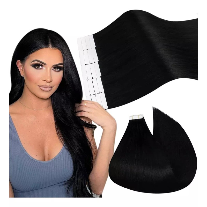 Cinta de negro azabache en extensiones de cabello cinta clásica en extensiones de cabello cabello humano, calidad del salón y cabello humano 100% real. Color clásico no tóxico y libre de contaminación para mujeres y niños.